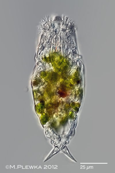 | Encentrum felis; a species with conspicuous symbiotic algae (zoochlorellae) and also brown defecation pellets. Head ≈ 1/3 of total length and retrocerebral sac with red granules surrounding a red cerebral eyespot. (5) |