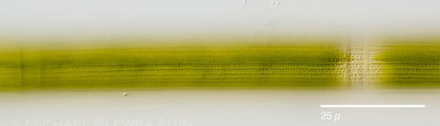 | Closterium lineatum; the same cell as above, focus plane on the finely straited cell wall with fine pores. (2) |