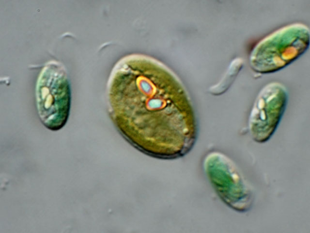 | Chroomonas baltica, a blue-green cryptophyte due to phycocyanin in the single chloroplast. (2) |