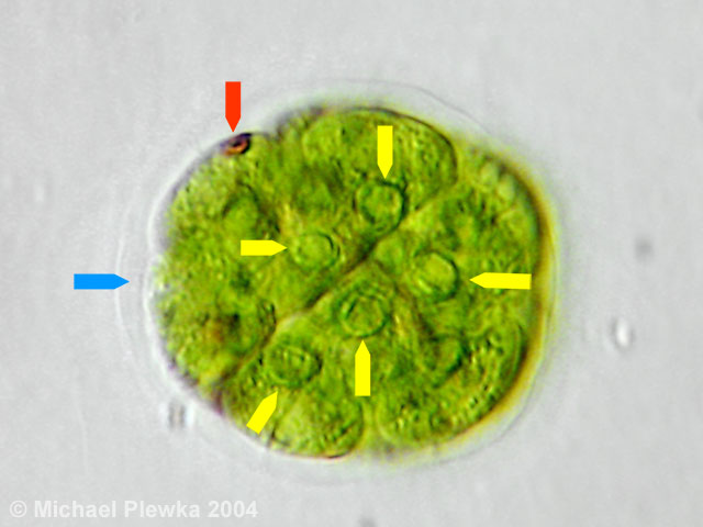 | Pandorina morum; kugelige bis elliptische Kolonien aus 8-16 Zellen. die eng beieinander in einer gemeinsamen Gallerte liegen und sich berühren. Chloroplasten mit Pyrenoid (gelbe Pfeile) ; Stigma (roter Pfeil); blauer Pfeil: abgesetzte äußere Gallerthülle |