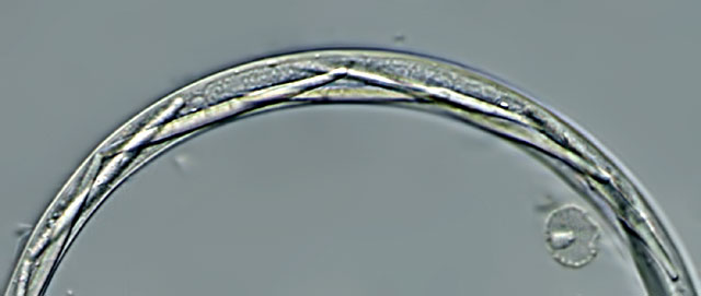 | Farbloser Augenflagellat (Cyclidiopsis acus): ein ca 120µ großer, osmotrophisch (Aufnahme von gelösten Stoffen durch die Zellmembran) lebender , farbloser Flagellat. Die Nadeln sind Paramylon"körner" (s.u.) |