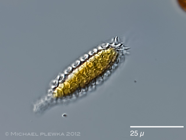 | Mallomonas insignis; im Gegensatz zu einigen anderen Mallomonas-Arten ohne Nadeln an den Schuppen |