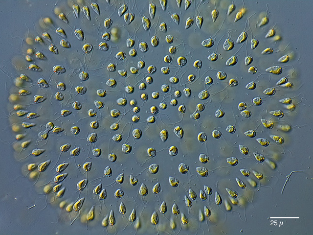| Wimperkugel (Uroglena volvox) (3.4.2011); jede Zelle weist 2 unterschiedlich lange Geißeln auf. Die Zellen besitzen (im Gegensatz zu Synura) keine Schuppen |