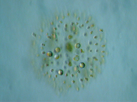 | Wimperkugel, Durchlicht (Schieflicht). Im 26.4. 2004 trat eine Algenblüte im Teich auf. Diese wurde fast ausschließlich von der Goldalge gebildet. Die Wimperkugel trat zusammen mit dem Rädertierchen Keratella auf. Nach 3 Tagen waren die Wimpernkugeln nicht mehr nachzuweisen.Uroglena volvox wird außerden manchmal von dem Rädertier Cephalodella edax befallen |