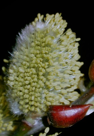 Darunter: Längsschnitt durch weiblichen und männlichen Blütenstand. Man kann deutilch die Nektardrüsen erkennen, die für die Bienen im Frühjahr die erste Nahrungsquelle bilden
