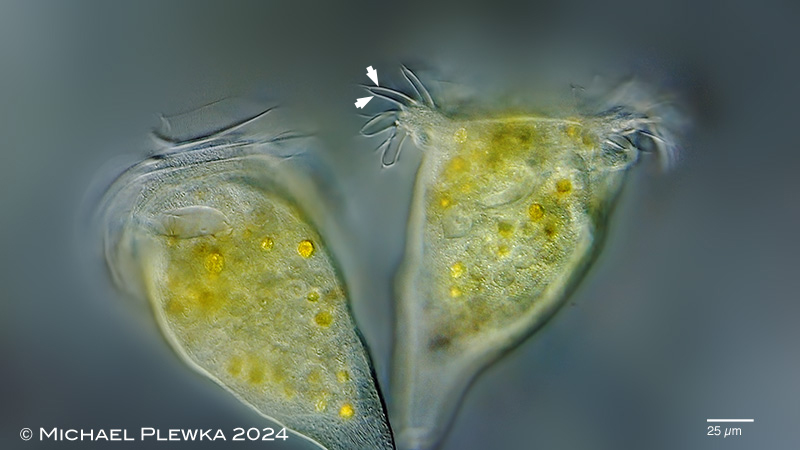 | Campanella umbellaria: lateral view of two specimens in different focal planes showing different moments of the metachronal movement of the adoral cilia and undulating membrane. For some milliseconds of the metachronal wave cycle two cilia of adjoining ciliary rows seem to be in phase in a typical pattern (the arrowheads point to one example of this). The beating frequency of the cilia is ≈ 15Hz, which is approx. half the beating frequency of Vorticella sp. (≈36Hz). See also video of the metachronal movement here >>> (3) |