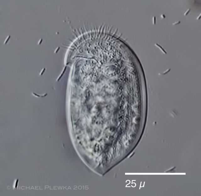 | Chilodonella caudata; dorsal view, showing the conspicuous "sting" at the posterior end. The arrows point to the dorsal brush. |