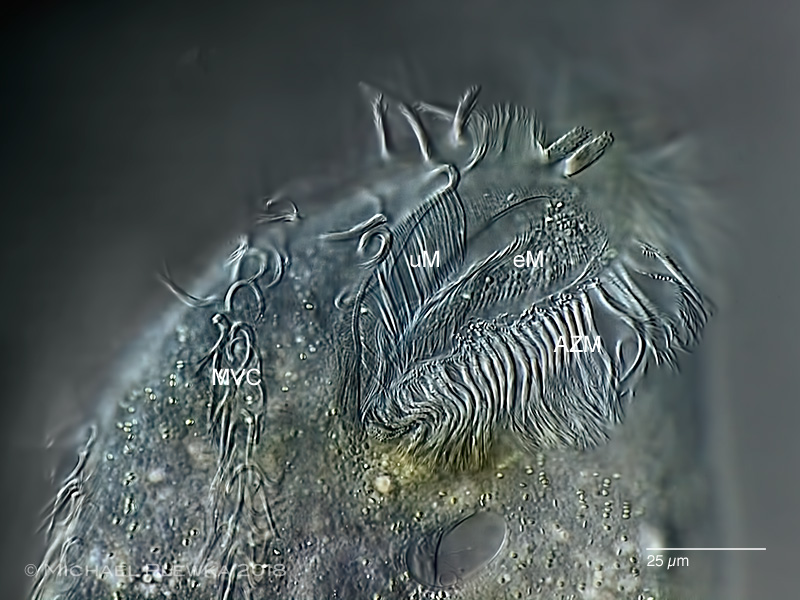 | Urostyla grandis: anterior part of the ciliate; focus plane on the oral apparatus. AZM: adoral zone of membranelles ; eM: endoral membrane; uM: undulating membrane; MVC: midventral cirri. (3). |