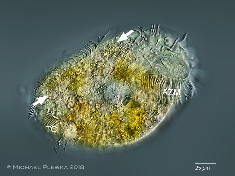 | Urostyla grandis: same specimen, focus plane on the ventral side. The arrows mark one of the several lines of the cortical granules. AZM: adoral zone of membranelles; TC: transversall cirri. (3) |
