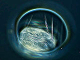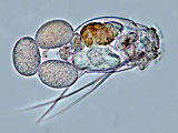 When a so-called "mictic stimulus" ("Mixis stimulus" in German) occurs in the environment, which could be for example: changes in the chemical composition of the surrounding water or the temperature, the females may produce haploid eggs. If these eggs are not fertilized they develop into haploid males (blue) which are usually much smaller (there are exceptions, for instance Asplanchna) and look different from the females. They are called dwarf males. (sexual dimorphism). The males can now fertilize the mictic eggs of mictic females. These fertilized eggs (brown) are called "resting eggs". The resting eggs have a mechanichal and also chemical very durable shell which is species-specific and enables the eggs to survive bad environmental conditions like ice in ponds or dryseasons