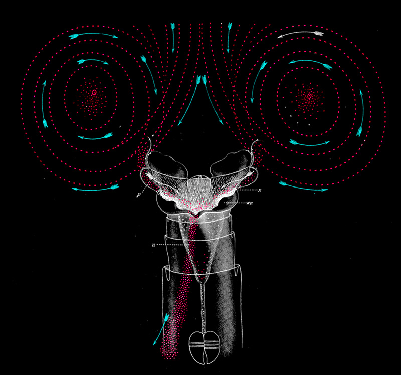 | Zelinka also provided the template for the next figure, which visualizes the water flow caused by the cilia movement of the bdelloid rotifer Mniobia symbiotica. The water flow was made visible in the preparation by carmine granules (shown here in carmine red). The turquoise arrows mark the direction of flow: |