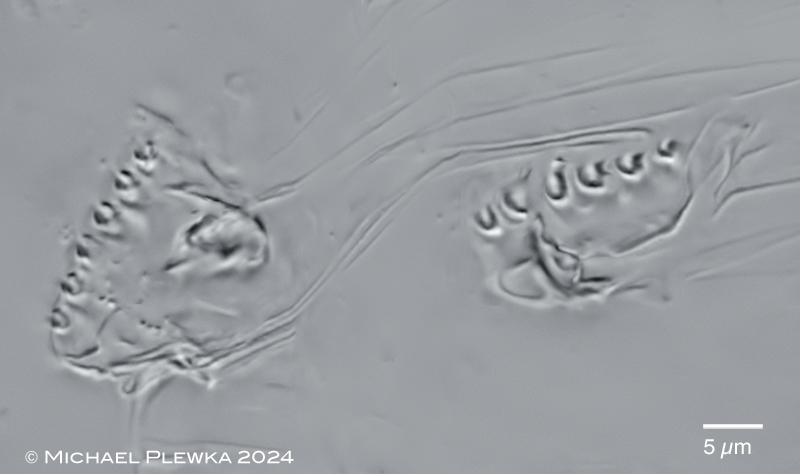 | Adineta sp. 6 hexahamata; rakes of specimen which has been semi-macerated by SDS. Rakes with 6 U-hooks (hence the name!) each. (2) |