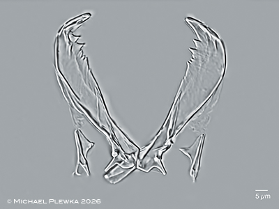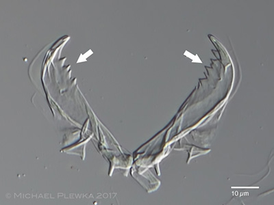 | Asplanchna priodonta, incudate trophi of a macerated specimen. Left: from (4). Right: specimen from (10). The inner margins of the rami are dentated (arrows), which is in contrast to Asplanchna girodi. |