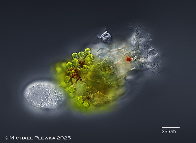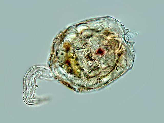 | Brachionus angularis; specimen with amictic egg and the euglenid flagellate Colacium sp. as epibiont on the lorica. Also visible is a peritrich ciliate. (3) |