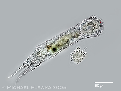 | Cephalodella forficula, lateral view. The habitus of this species is quite similar to Cephalodella stenroosi, but C. forficula has a frontal eyespot and several spicules (arrowheads) on the dorsally bent toes (see also images below). (4) |