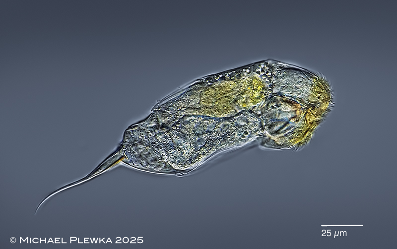 | Cephalodella paxi; an eyeless species; lateral view. The relation: total length / length of toes is 3.5 in this specimen. Toes are S-shaped, the tips are bent ventrally. This species seems to feed on diatoms. (1) |