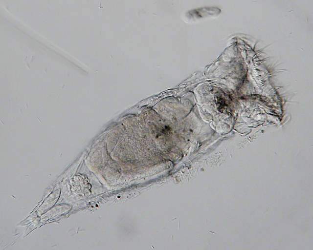 | Epiphanes senta: another specimen from the same location. This sample had been totally dry for 3 months in my room. Accidentely the detritus was soaked with water again, and several of these rotifers occured (?? from eggs???) (3) |