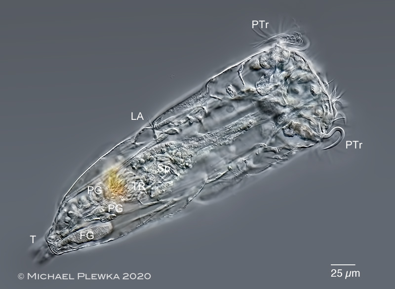 | Epiphanes senta: male specimen (dorsoventral view) from (4). FG: foot glands; LA: lateral antenna; PG: prostate glands; PTr: pseudotrochus; Sp: spermatozoa; T: toes; TR: testicular rods. (4) |