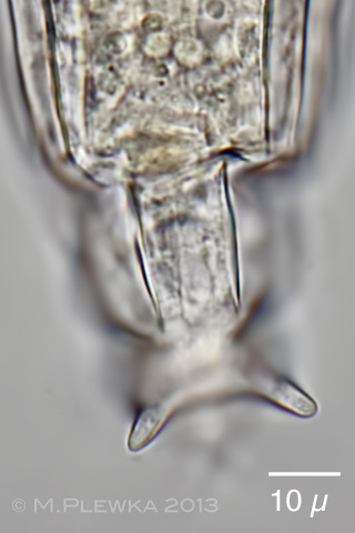 | Macrotrachela plicata var. hirundinella, lateral view. White arrowhead: appendix (1) |
