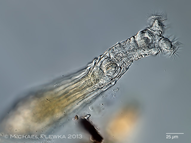 | Identification of this species is problematic: Although the head with the 2-lobed upper lip looks like a Macrotrachela species, there is none with the dental formula 3/3. The adhesive plate makes clear that it must be a Mniobia, but none of the descriptions of DONNER fits exactly the features of this species. M. tentans or M. bredensis come closest. |