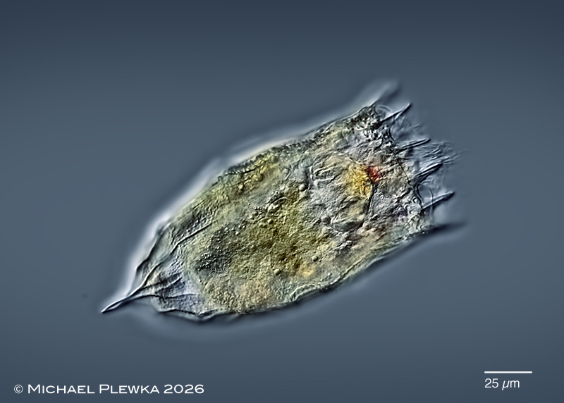 | Notholca foliacea, ventral view; typical is the conspicuous spine (arrowhead) on the dorsal posterior end of the shell. |