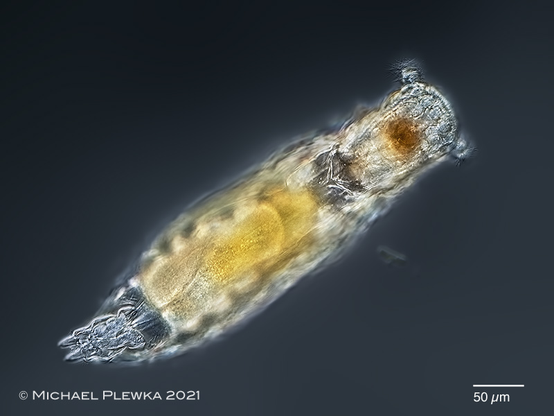 | Notommata cerberus: specimen from (3), stained with neutral red to visualize the retrocerebral organ (RCO, arrowhead). |