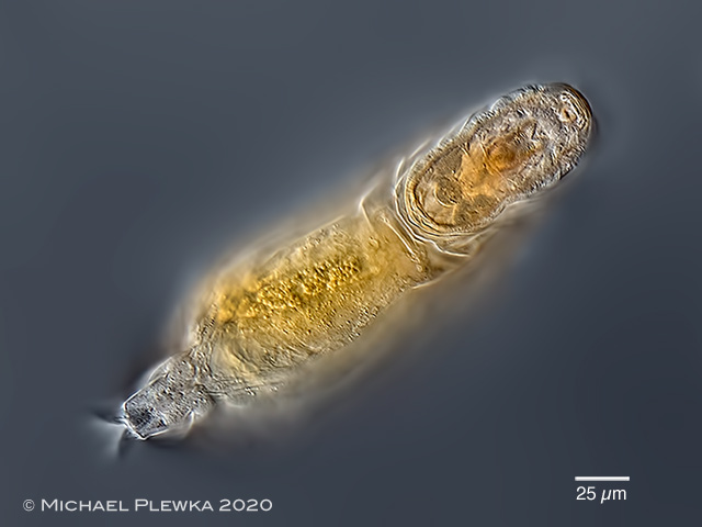 | Notommata glyphura; two aspects of specimen from (2), ventral view; different focus planes. Upper image: focus plane on the ciliary field and the slightly ventrally curved toes. |