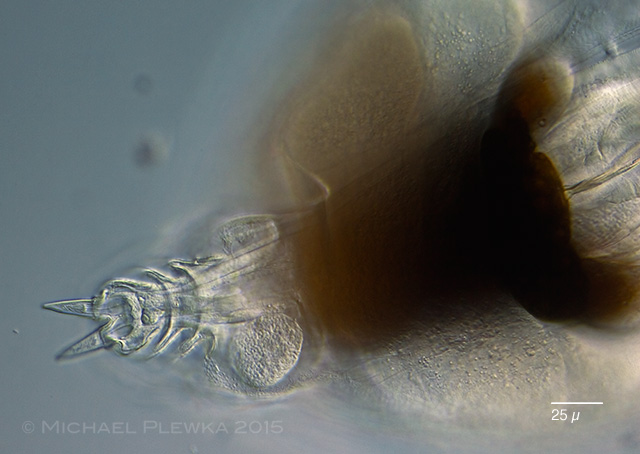 | Notommata pachyura pachyura, another specimen from the same location, dorsal view; creeping. Focus plane on the brain and RCO. |