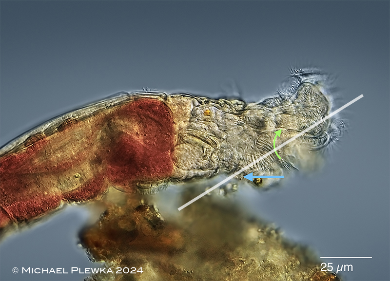 | Philodina cf roseola; whirling; lateral view. Focal plane on the cilia of the buccal field/ buccal tube. There are two different pairs (left and right side) of ciliary fields generating different water currents. The arrows indicate the direction of the metachronal waves of these cilia, not the direction of the water flow. Although the direction of the metachronal waves indicated by the green arrow is to the dorsal side, the water flow is to the ventral side. Ingested particles in this area are transported outwards. The blue arrow marks the pair of ciliary fields that create a current towards the mastax. The white line marks the plane of the optical transect in the lower left image. The same behavior of the coronal cilia could be observed and documented for Philodina alata. |