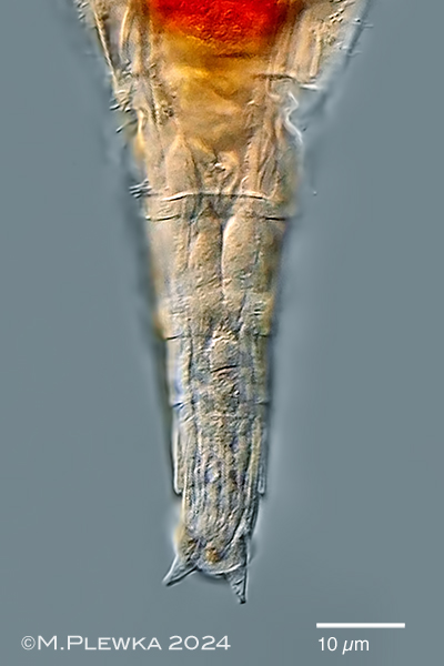 | Philodina roseola; foot (specimen from (1); dorsal view of relative short acute spurs with interspace; spur-bearing segment width (SSW): ≈9µm; spur length (SL: ≈5µm; spur base width (SBW): ≈3µm; interspace: ≈4µm. |