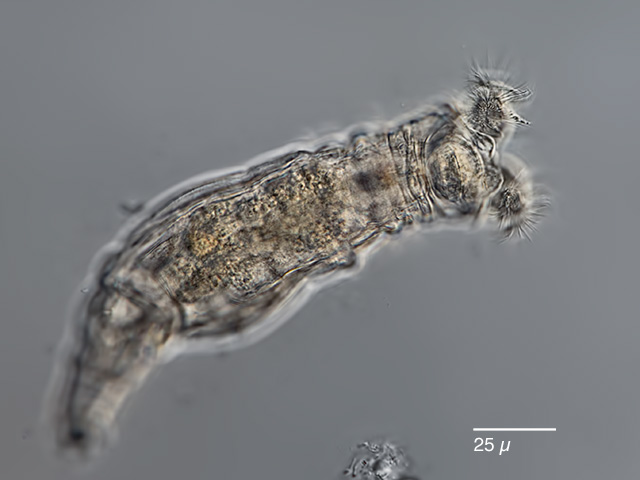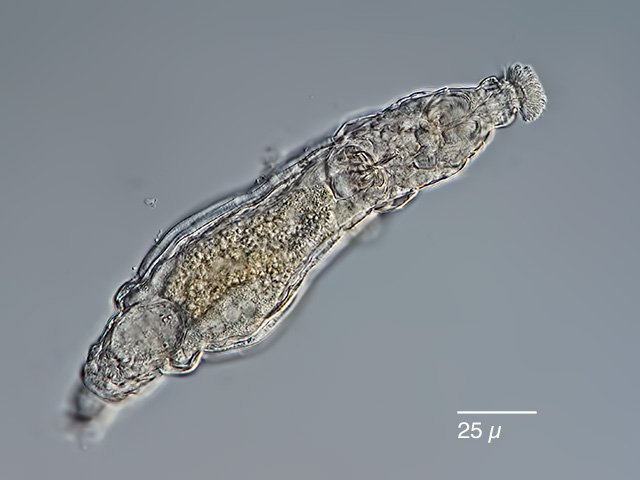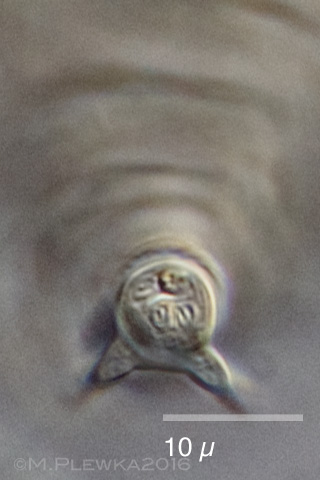 | This species is difficult to identify. I do not know any other species of Philodina which has such long cilia at the rostrum. The upper lip correspods to the descriptions of Murray 1906. No eyespots could be observed in this single specimen. |