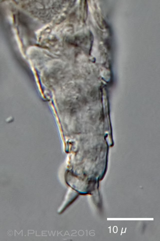 | Philodina brevipes; two aspects of the foot with spores and 4 toes, recognizable in the left image. |