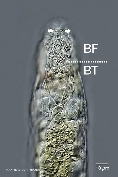 | Proales fallaciosa, dorsal view, optical transect. This species characterized by the single asymmetric orientated cerebral eyespot located on the right side (arrowhead) and a dorsal papilla/appendage between the toes (arrow; this appendage is in contrast to Proales decipiens) |