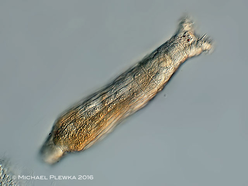 | Rotaria citrina: creeping specimen.This species is characterized by a yellowish cuticula of the trunk. The content of the stomach is usually light orange. Two red eyespots on the rostrum. (1) |