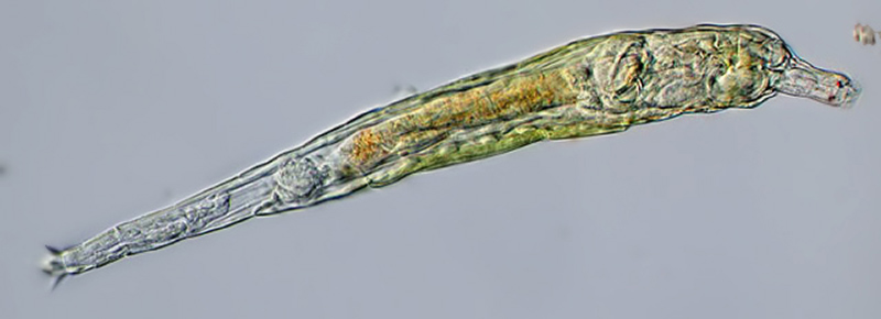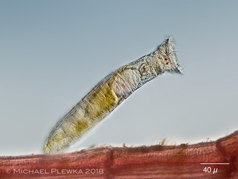 | Rotaria citrina: one of the few bdelloid species that can be found in marine environments; here sitting on the red alga Polysiphonia sp. (6) |