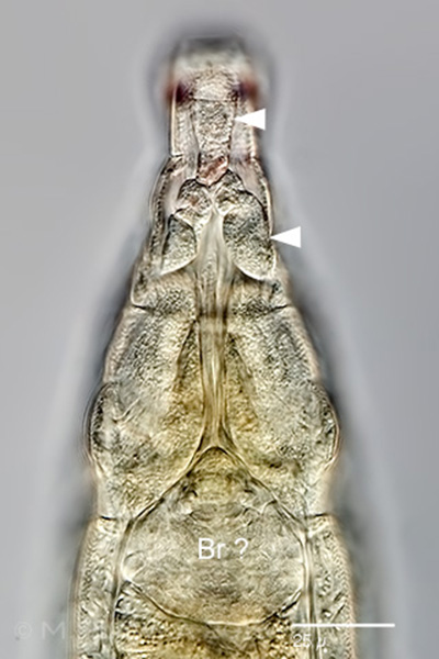 | Rotaria citrina: same specimen as above. This pregnant female is carrying two daughters which can be recognized by their trophi (arrowheads). This shows that R. citrina (like all members of the genus Rotaria) is viviparous. The trophi of the daughters have the same size as the one of their mother (arrowheads), as the trophi are fully developed when the children are released. (2) |