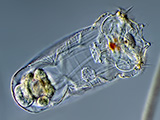 Bdelloid rotifers are survival artists, not only concerning desiccation, but they can also survive lowest temperatures for example in liquid nitrogen. Now some researchers have found the bdelloid rotifer Adineta sp. in a drill core from Siberian permafrost, which has been shown to be 24000 years old. The recovered specimens were kept in culture, from which I had the chance to take some images whiche are presented here >>>> |